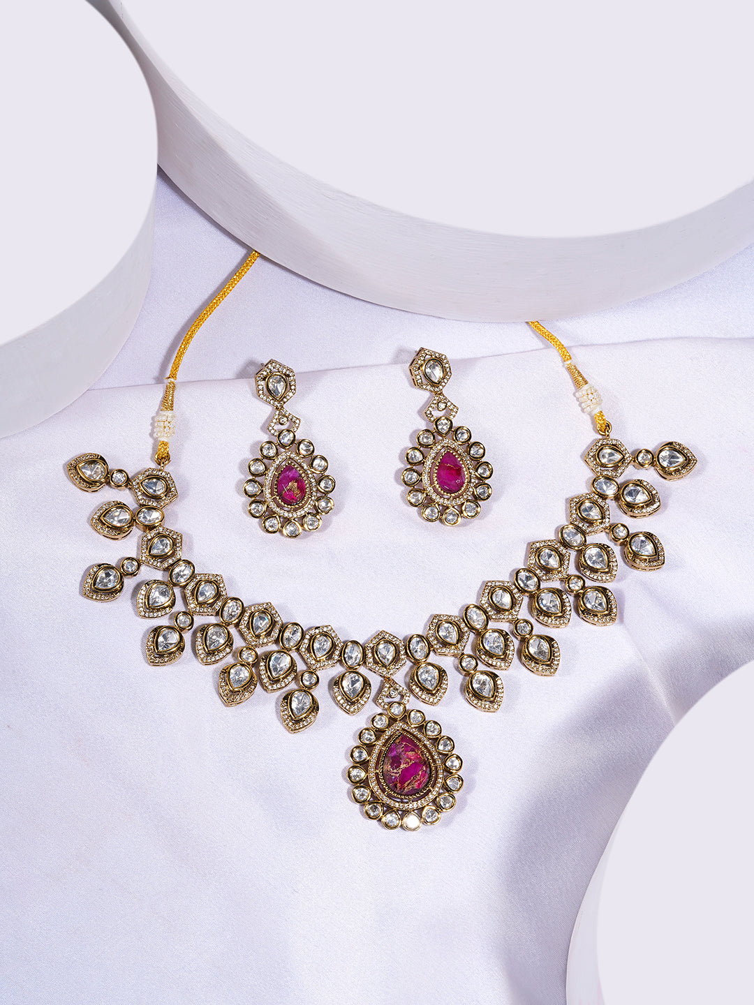 Elevate your style with the Mehndi Antique Ruby Polki Necklace Set, crafted from premium brass with a stunning antique finish. Featuring Texline Ruby gemstones, Polki accents, and American diamonds, this bold, intricately designed set is a timeless statement piece
