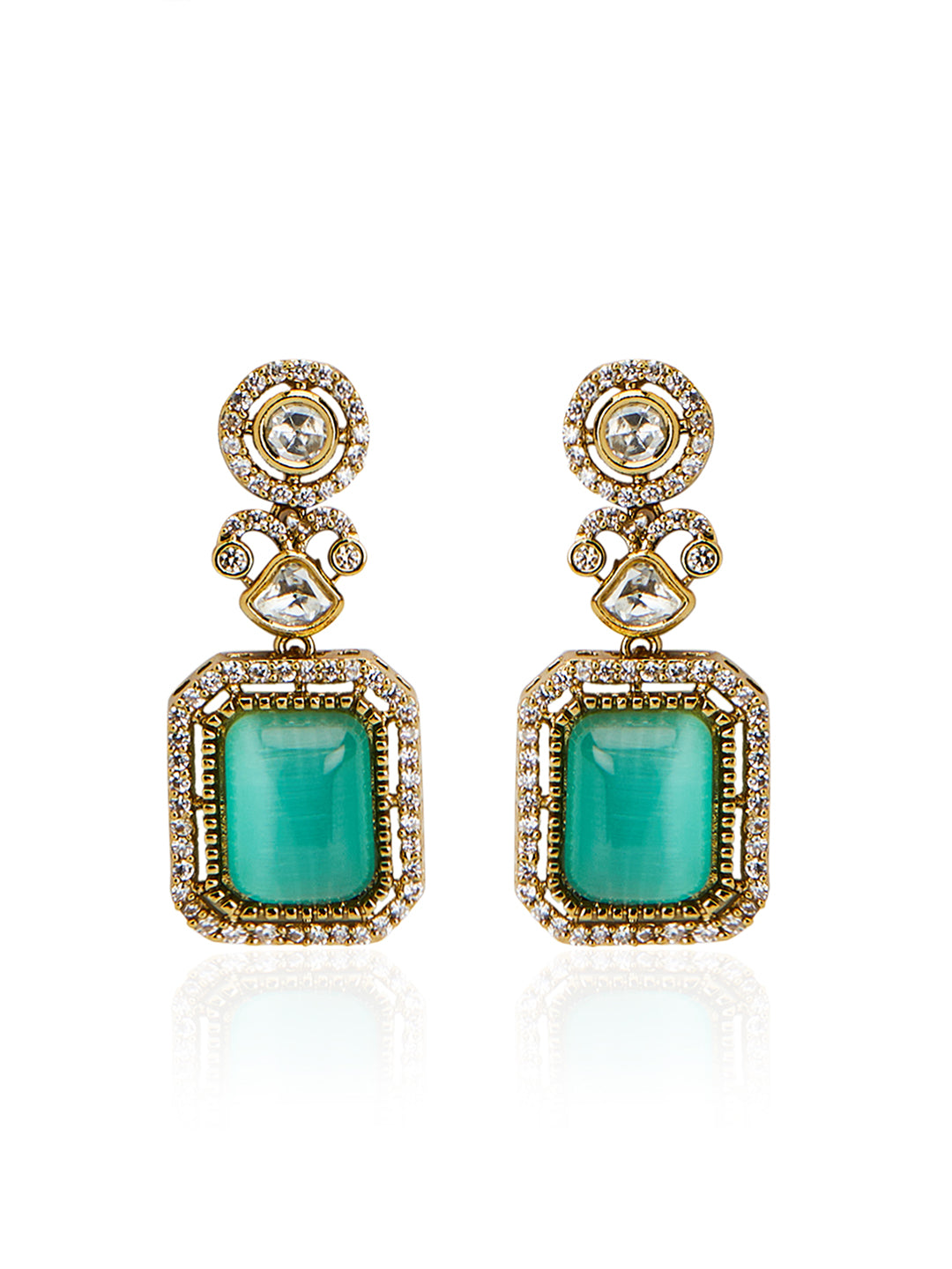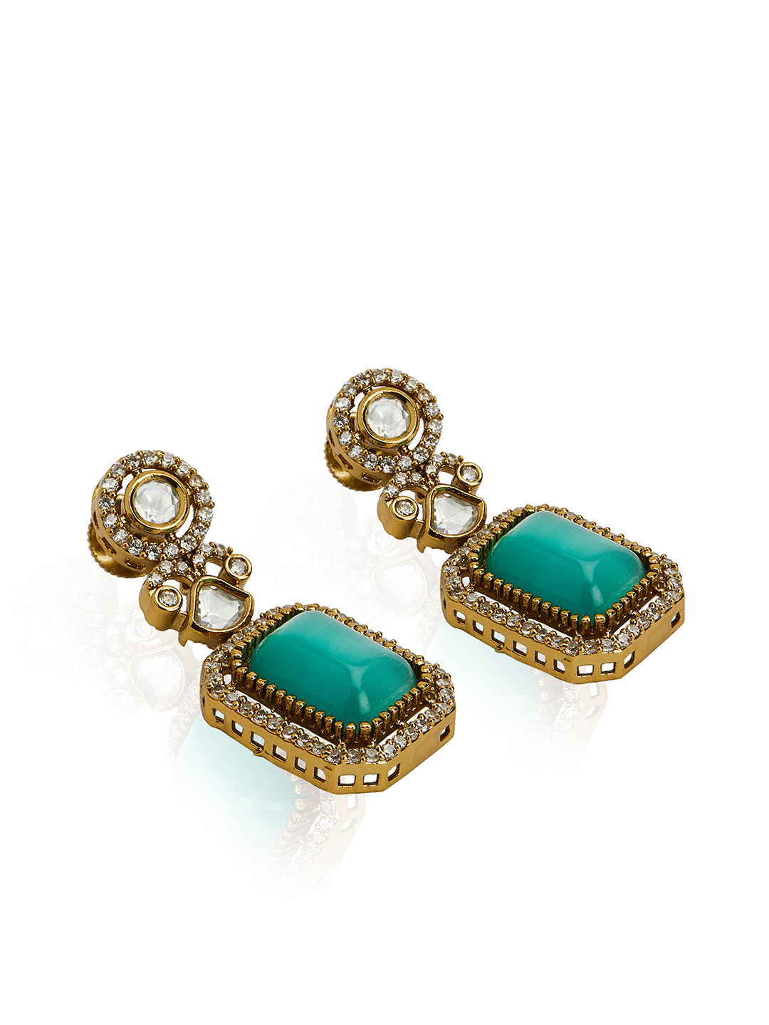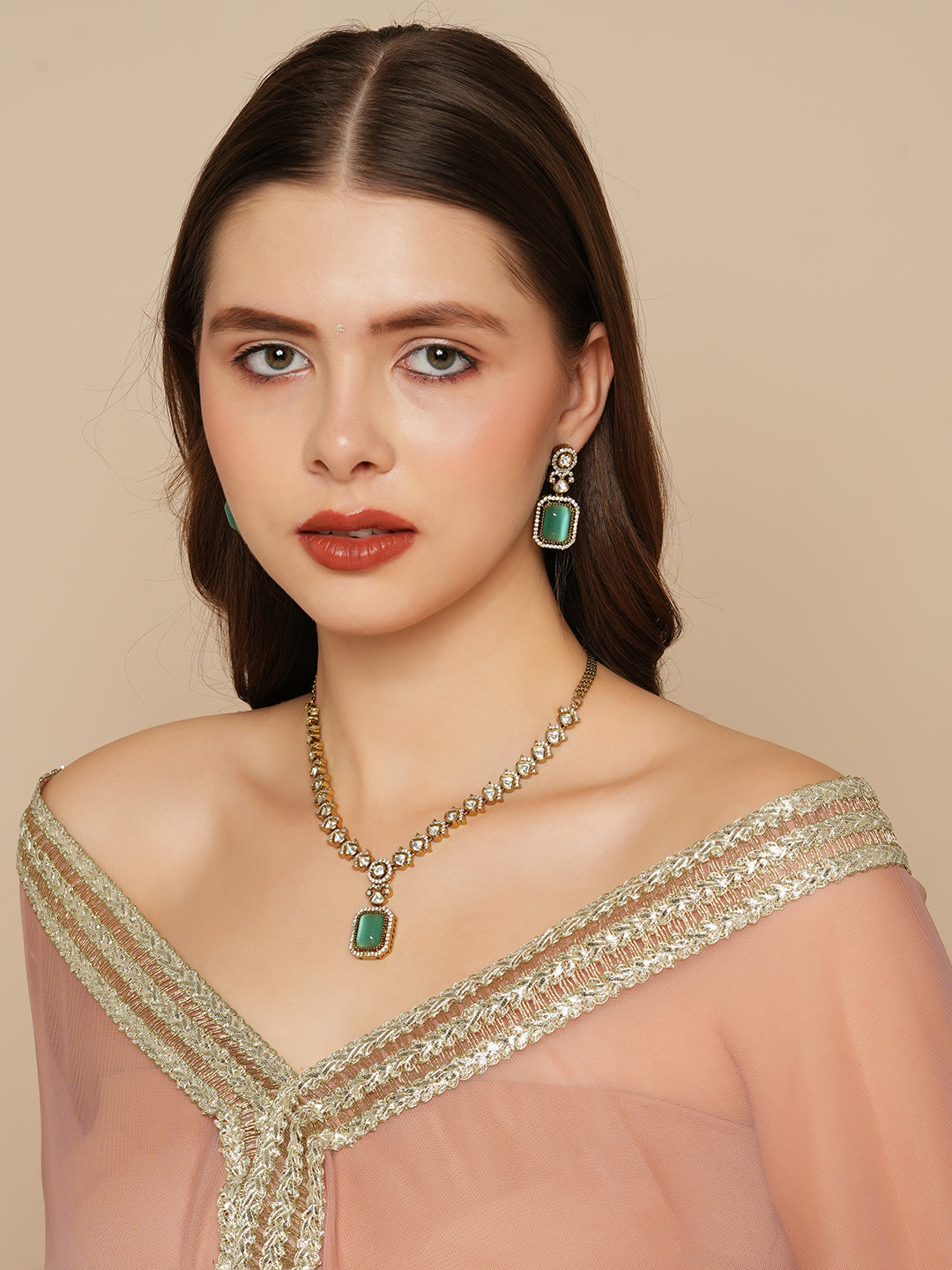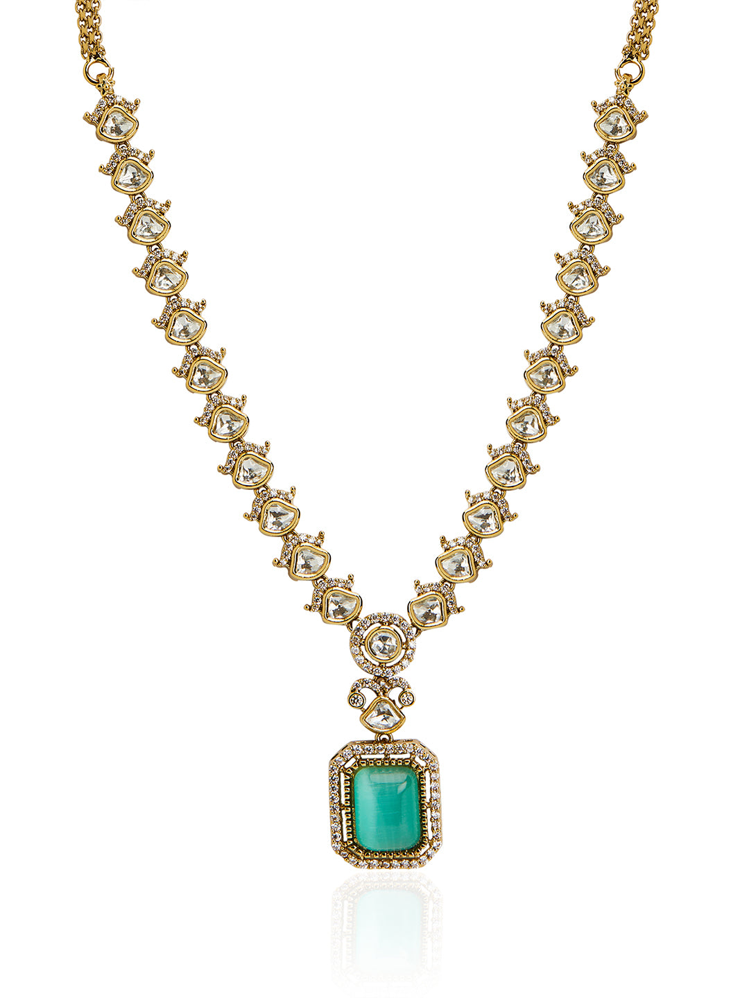 Indulge in elegance with the Mint Monalisa Polki Pendant Necklace, crafted from premium brass with a mehndi antique finish. Featuring a mint stone pendant, Polki, and American diamonds, it blends traditional artistry with modern sophistication.